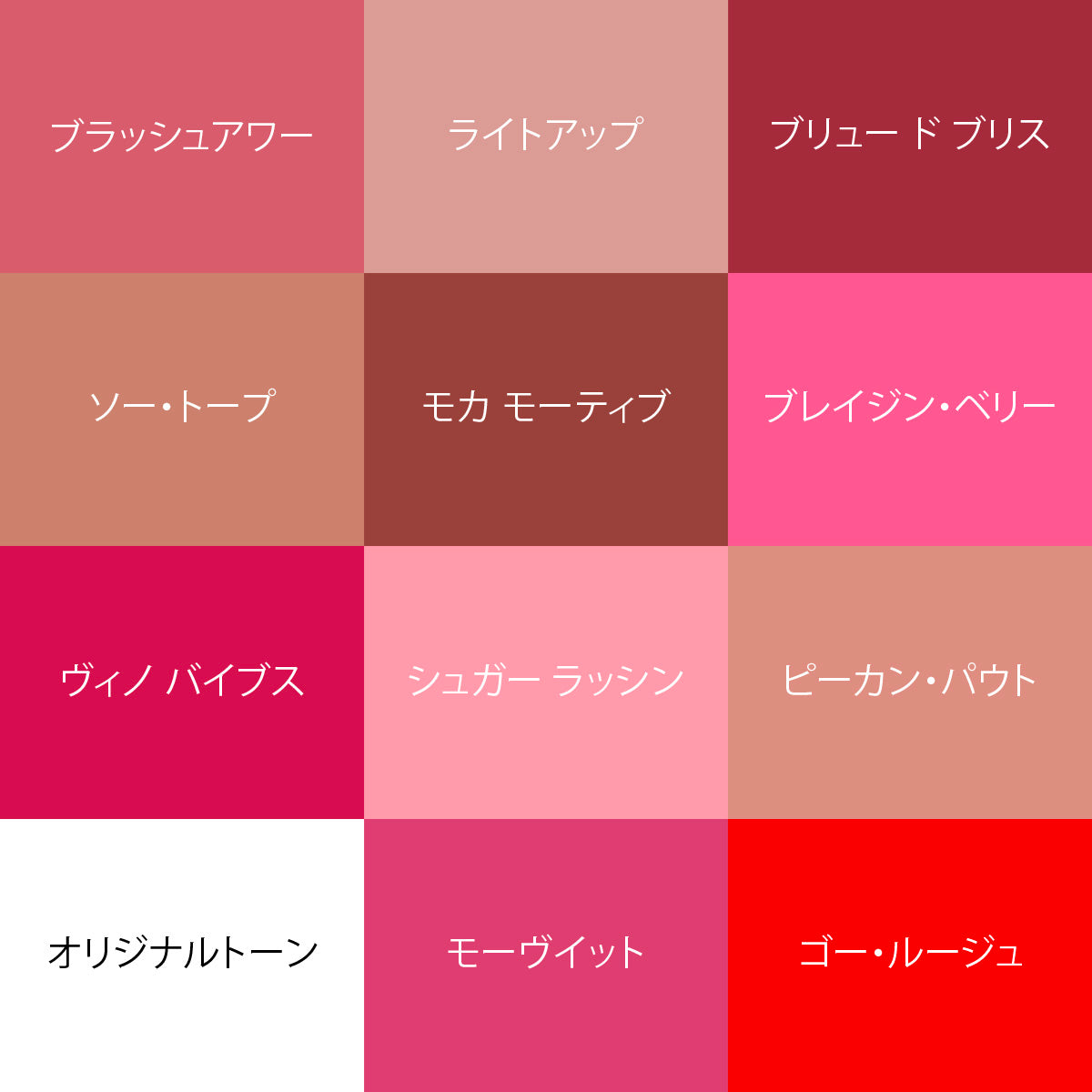 選べる12色展開で、ひと塗りでツヤ感を演出。ナチュラルから華やかな印象まで、お好みに合わせてご使用いただけます。