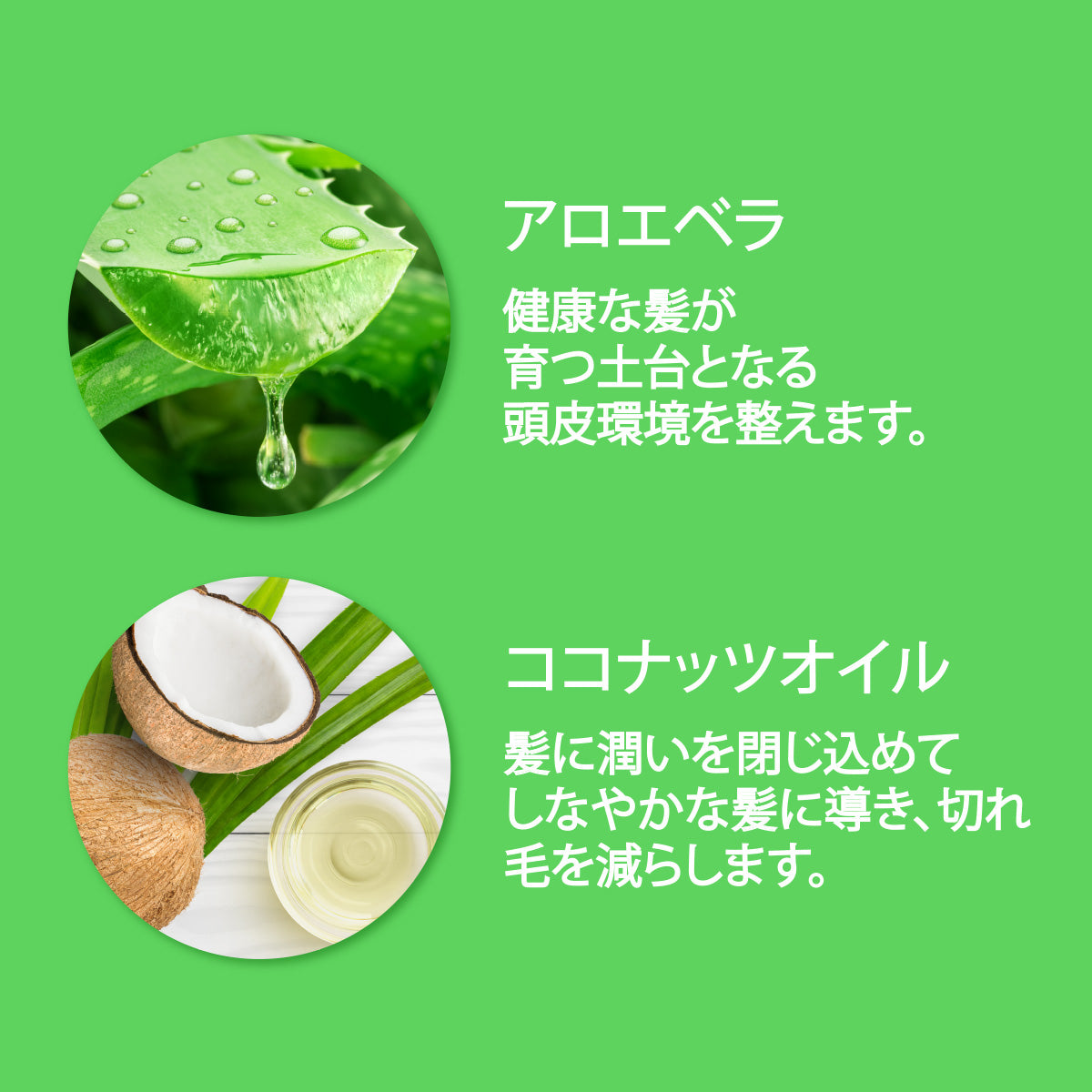 アロエベラとココナッツオイルのナチュラルブレンドが髪を補修しツヤを与えてくれます。 みずみずしい泡で髪を重くすることなく潤いで満たし、洗うたびにヘルシーで弾むような髪を感じて頂けます。