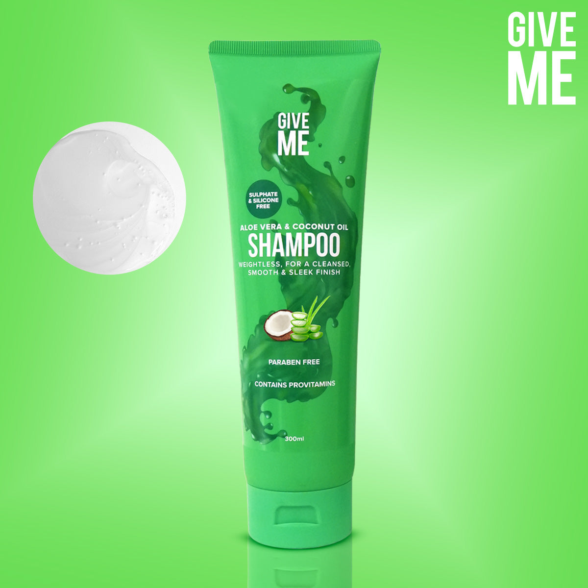 Give Meのサルフェート・シリコンフリーアロエベラ & ココナッツオイル シャンプーをぜひお試しください。アロエベラとココナッツオイルの強力なブレンドで丁寧に作られています。軽やかな使用感で、髪に深い栄養を与え、潤いをしっかり閉じ込めるこのフォーミュラで、リフレッシュされた髪を実感してください。